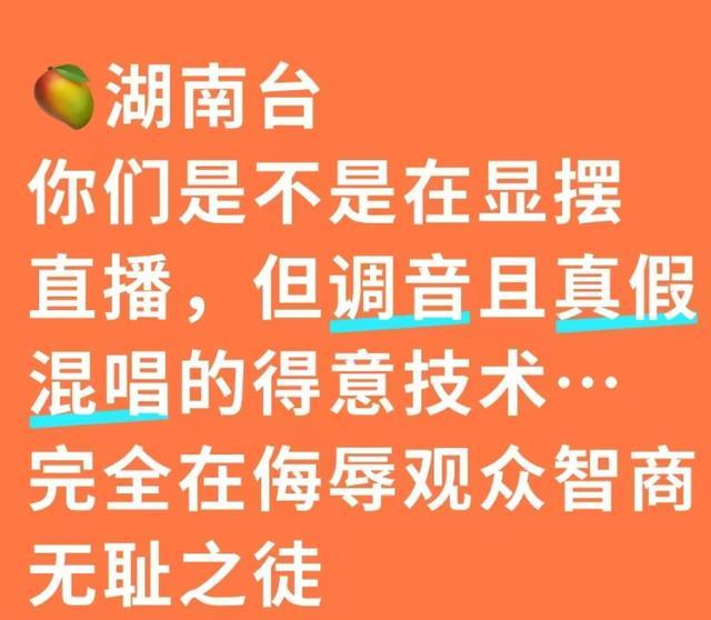早在跨年夜的时候,就有东谈主吐槽湖南台爱炫技,梗概是知谈我方的直播修音时刻很精致,刻意要秀出来,不论是歌手如故演员,就没一个真唱的。