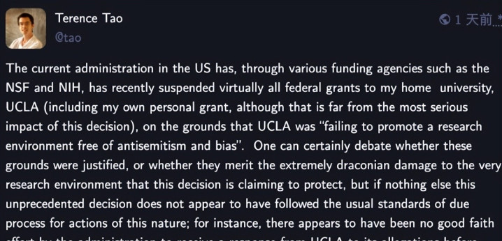 陶哲轩的个东谈主考虑经费随之停摆,悉数这个词团队的运作短暂堕入泥潭。为了确保考虑生们的资助不停供,这位大名鼎鼎的解释以致不得不推迟领取属于我方的夏令薪酬。