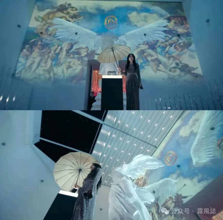 值得防备的是,剧中的投影壁画在原画基础上作念了蜕变,即画面中心有一对大翅膀,这个翅膀要连续镜头中的说念具总计看——包包展示台后头的雕像。