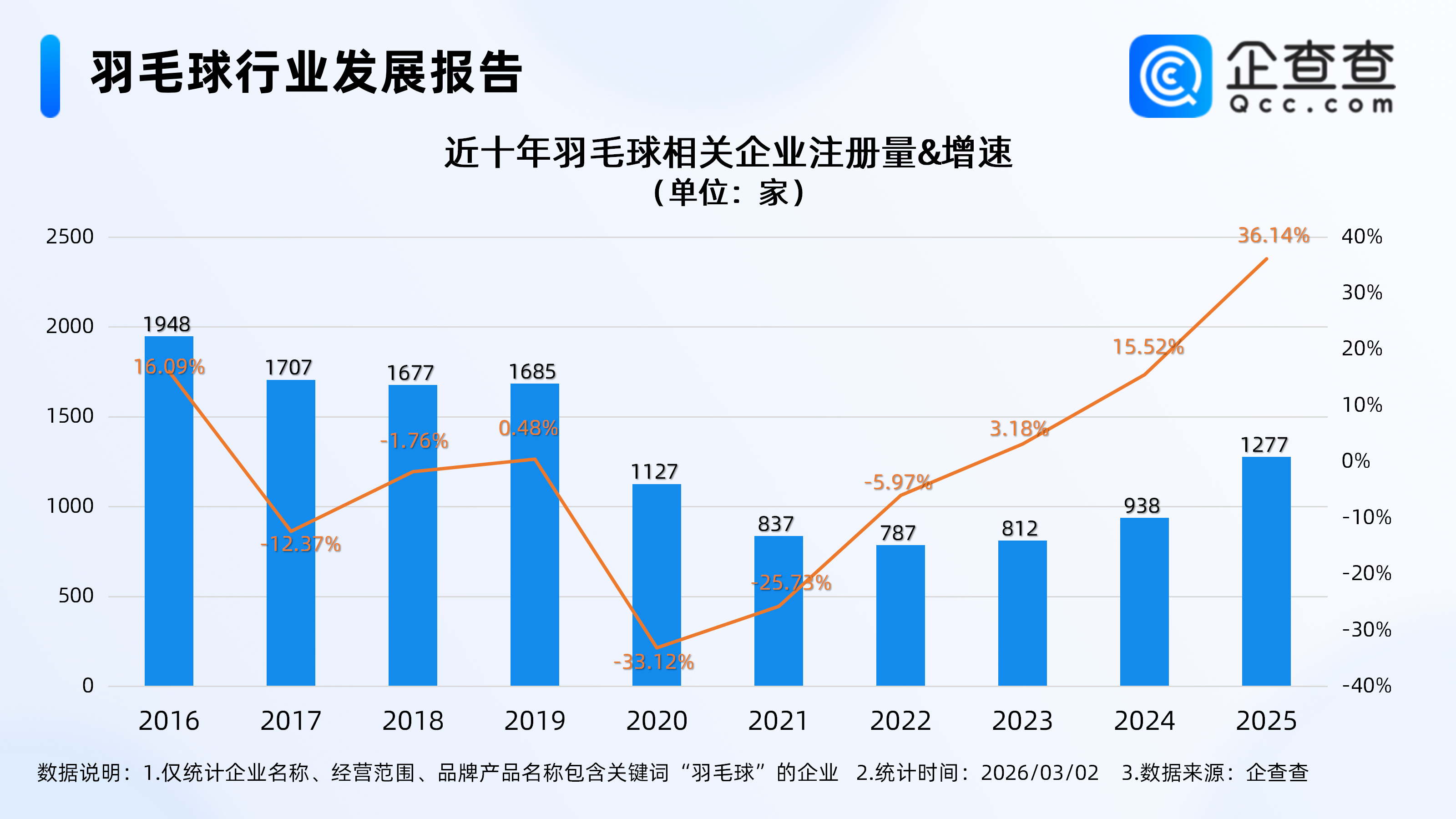 企查查数据表露,收尾3月2日,国内现有羽毛球关连企业1.36万家,近十年羽毛球关连企业注册量呈先减后增态势,2025年全年注册量同比增长36.14%至1277家,达近十年注册增速峰值。收尾现在,本年已注册131家关连企业。