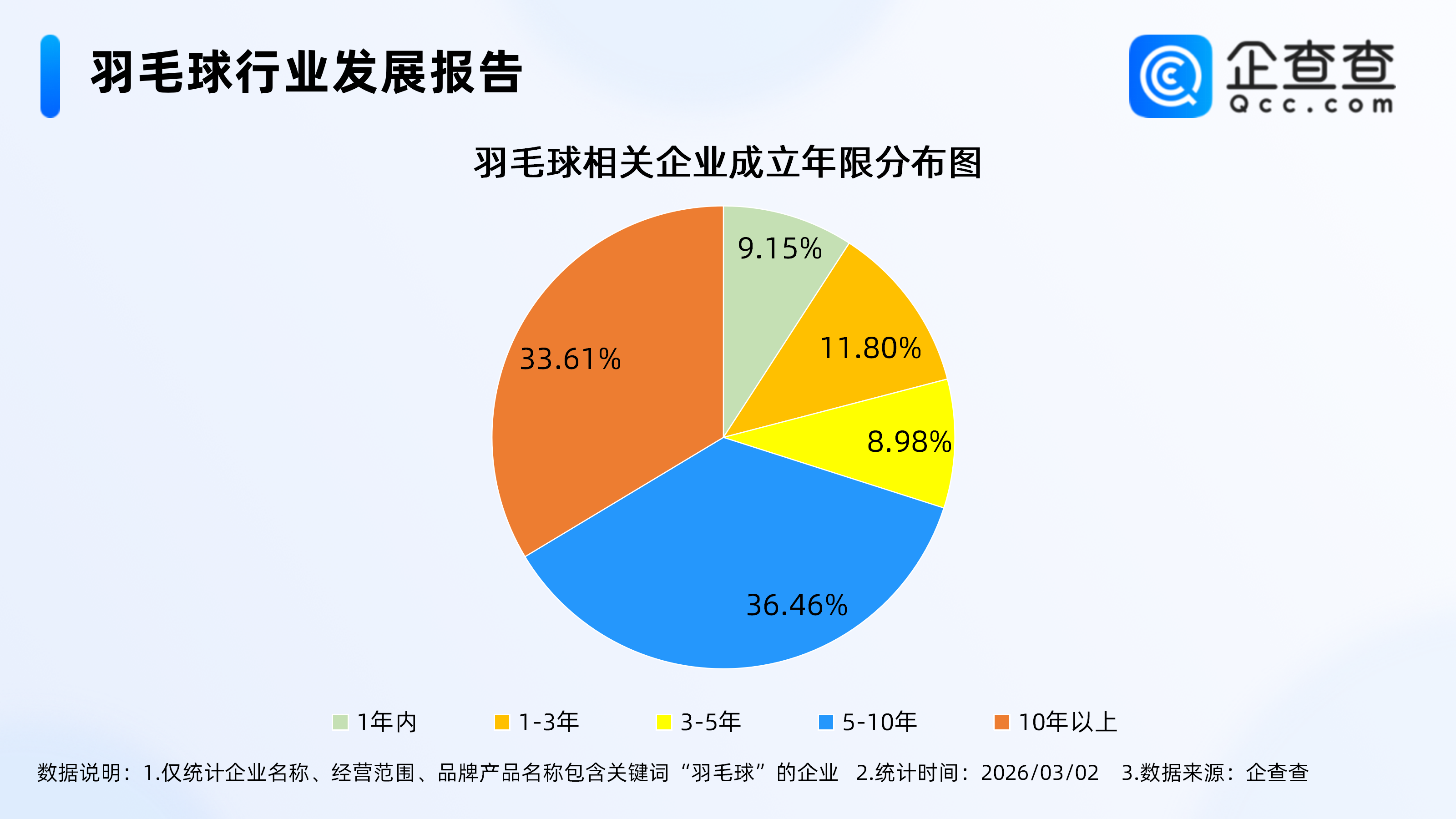 企查查数据表露,从策划时期来看,羽毛球关连现有企业多为老牌企业,诞生年限在5-10年的关连企业最多,占比36.46%,诞生10年以上的关连企业占比33.61%。