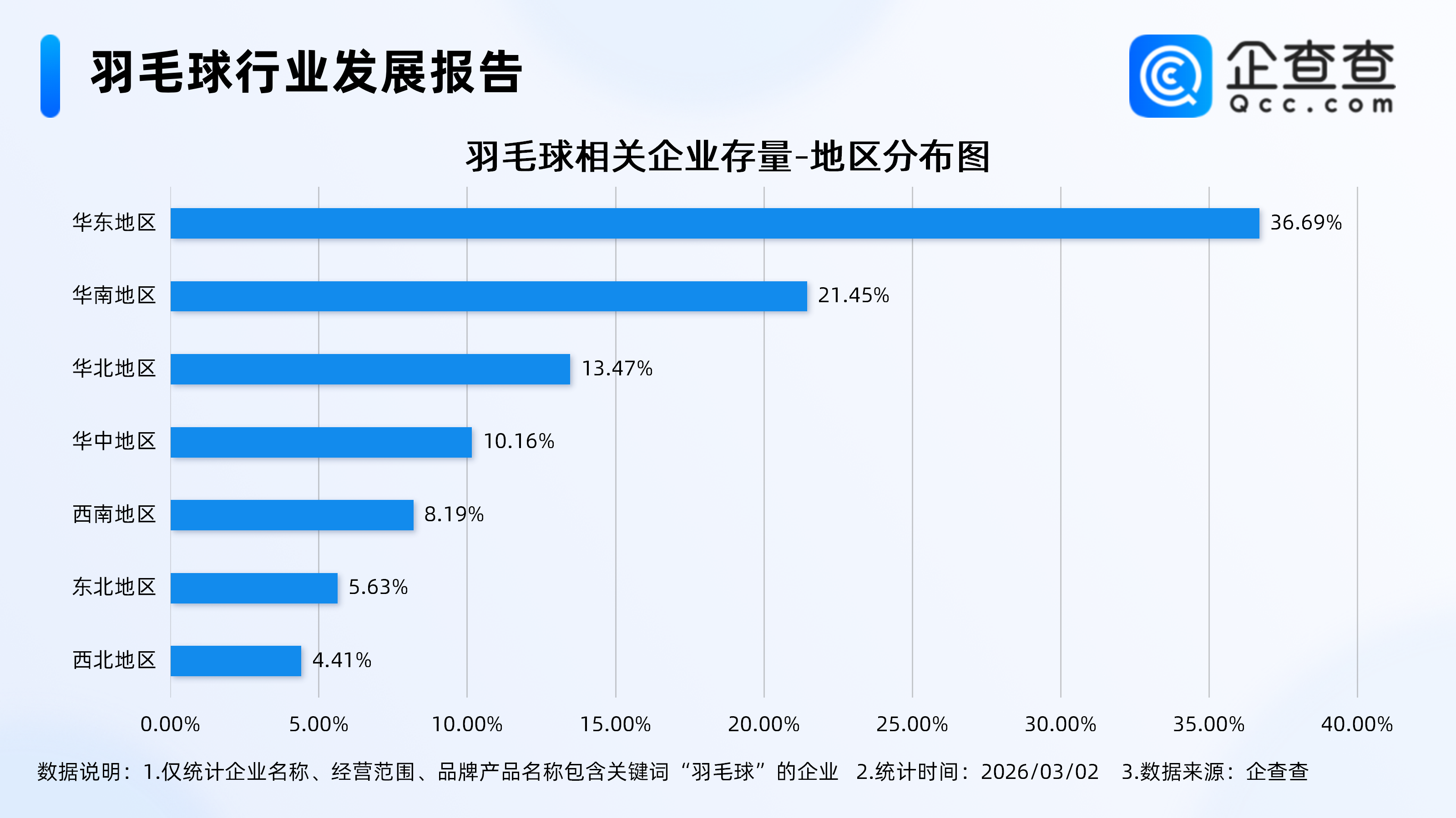 企查查数据表露,从地区散播来看,羽毛球关连企业聚拢散播在华东地区,占比达36.69%。其次,散播在华南地区、华北地区、华中地区的关连企业差别占比21.45%、13.47%、10.16%。其他地区占比均不及10%。