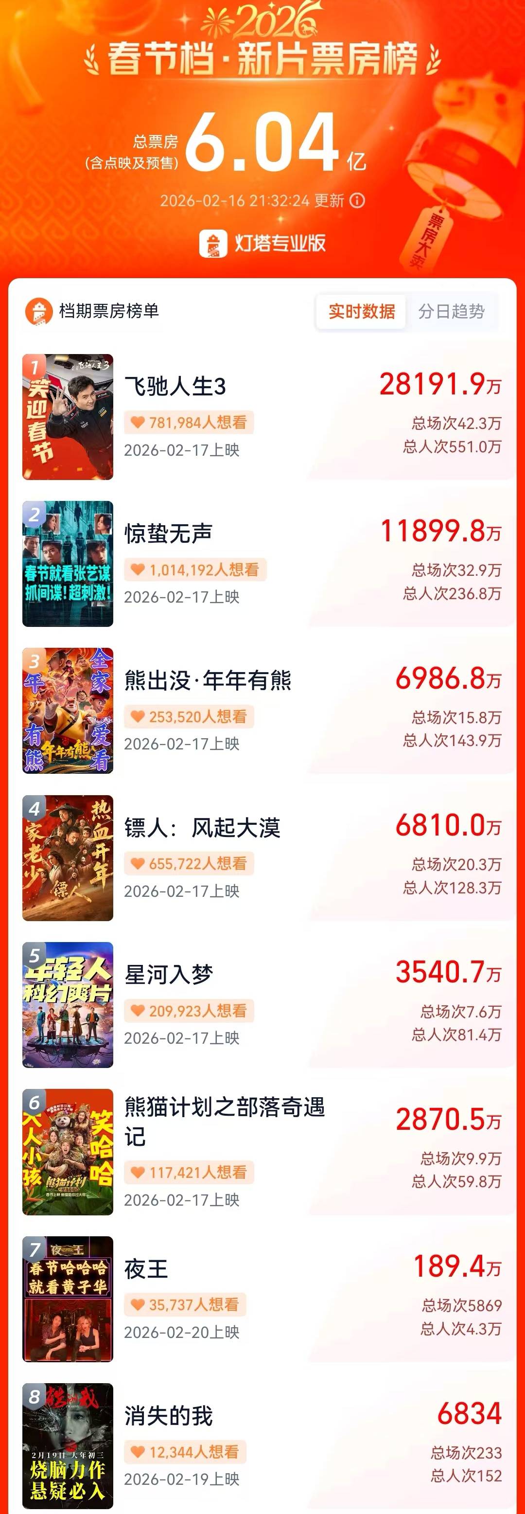 《银河入梦》《熊猫蓄意之部落奇遇记》预售票房各3541万元、2871万元,落在背面。《熊猫蓄意之部落奇遇记》在六部热片中恒久垫底。
