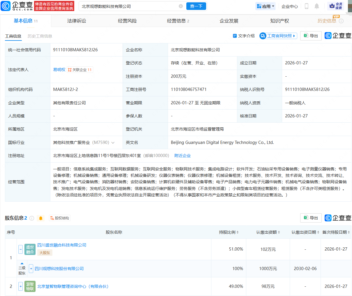 近日,北京不雅念念数能科技有限公司诞生,开云体育中国官方网站法定代表东说念主为易明权,三公app筹谋限度包含:物联网工夫处事;集成电路打算;石油钻采专用开荒销售;电子测量仪器销售;专用开荒修理等。企查查股权穿透知道,该公司由不雅念念科技(301213)全资子公司四川盛世交融科技有限公司、北京慧智物联处罚磋磨中心(有限结伙)共同握股。