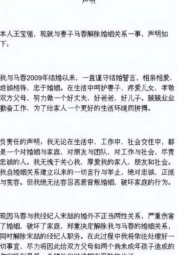 2016 年 8 月 14 日凌晨,王宝强切身在微博发布离异声明,直指马蓉与宋喆存在婚外不刚直两性关联,秘书告状离异并淹没宋喆牙东谈主职务。马蓉立地反击,告状王宝强骚动名誉权,宣称我方是受害方,还晒出疑似家暴的伤情像片,但其像片被网友指出系摆拍,未能扭转公论。