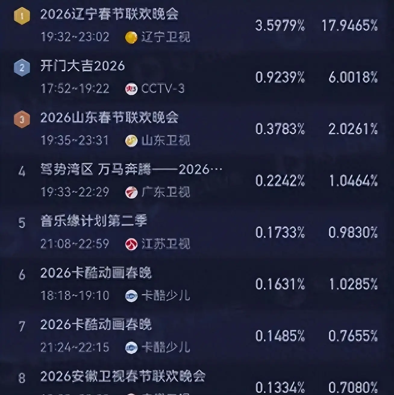 万万没念念到,2026年的第一匹收视“黑马”竟然是辽宁卫视,昨天播出的春晚收视率高达百分之三点五,平直登顶榜一。