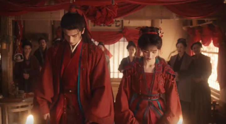 谢征为樊长玉系上发带,垂眸专注的看着她,她俯首微笑。发带随风漂荡,仿佛情意重复。幕后花絮的随性镜头成为经典,无声胜有声,预备尽在其中。