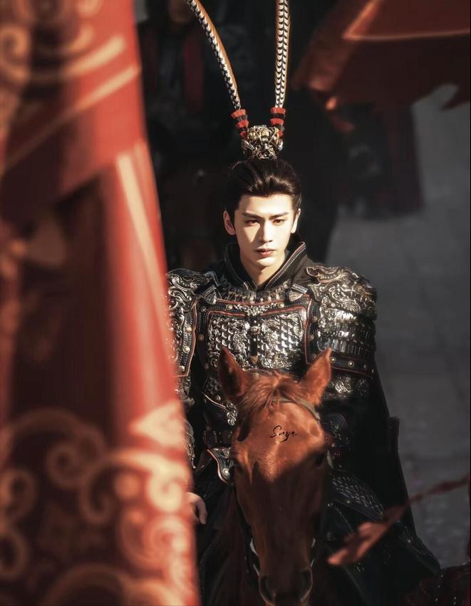 谢征披玄甲、戴雉鸡翎班师,这一造型是不是有点像皆天大圣回归,会通了游戏好意思学与历史典故,标识将军的威严与复仇回归。