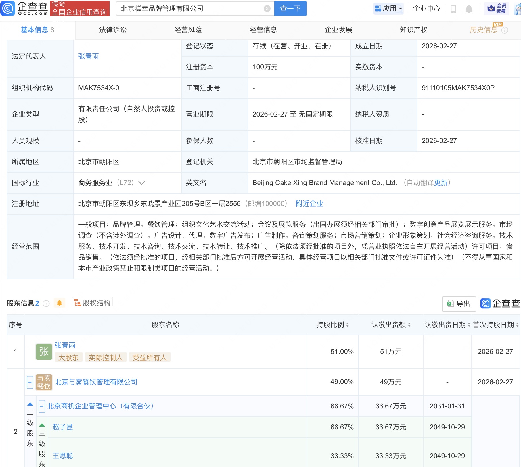 近日,北京糕幸品牌责罚有限公司确立,法定代表东说念主为张春雨,三公app相关领域含品牌责罚、餐饮责罚、食物销售等。企查查股权穿透瓦解,该公司由张春雨、北京与雾餐饮责罚有限公司共同合手股,其中王想聪通过北京商机企业责罚中心(有限合股)障碍合手股北京与雾餐饮责罚有限公司。